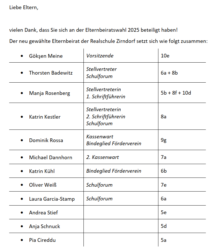 Falls dies in Ihrer Klasse bisher noch nicht geschehen ist, möchten wir Sie herzlich bitten, dies nachzuholen oder sich auf eine Person zu verständigen, die die Kommunikation zwischen Ihnen und dem Elternbeirat übernimmt. So können Informationen in beide Richtungen reibungslos fließen.